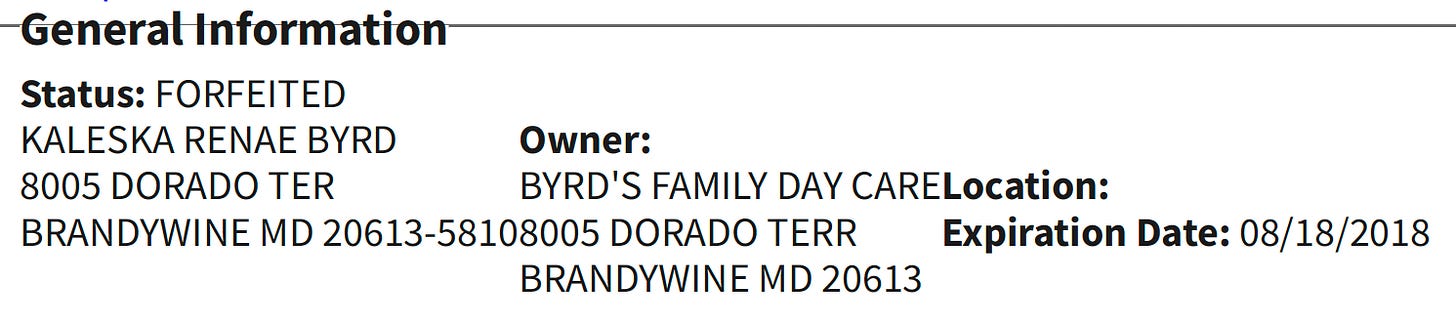 Kaleska Byrd ran a day care center since 2008 at their previous house, but the company was forfeited when she did not renew it in 2018 or pay $25. It now appears to have a new registration number, but the state record still shows the company as forfeited.