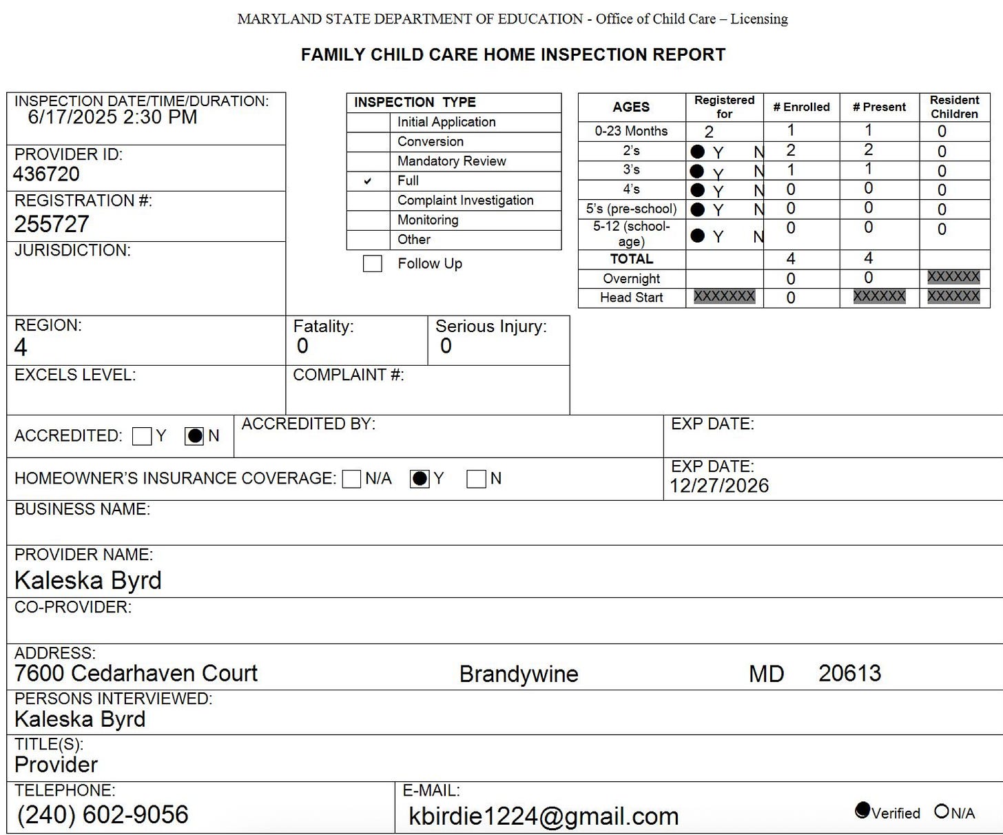 However, an inspection was conducted for the business on June 17, 2025, during which she had four children enrolled. The document notes that she is not accredited.